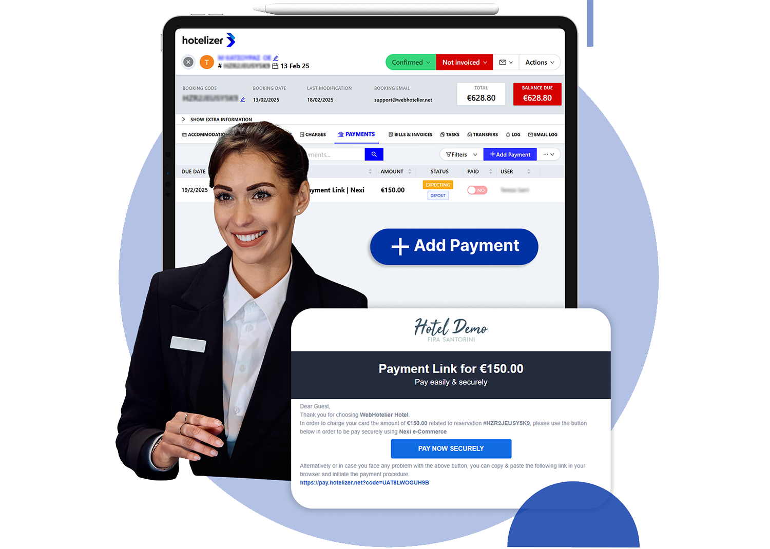 Δυνατότητα αποστολής προσωποποιημένων payment links μέσω email για άμεση πληρωμή, καθώς και χρέωσης καρτών μέσα από το ίδιο περιβάλλον, με αυτόματη ενημέρωση του hotelizer.