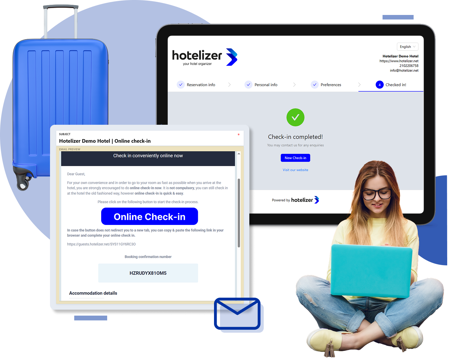 Με εργαλεία όπως online check-in, διασύνδεση με passport scanner και smart locks, οι επισκέπτες αποκτούν άμεση πρόσβαση στο δωμάτιό τους εύκολα και χωρίς αναμονές. Ενώ η επικοινωνία σας ενισχύεται με αυτοματοποιημένα & προσωποποιημένα emails για κρατήσεις, ακυρώσεις, προώθηση επιπλέον υπηρεσιών και follow-up αιτημάτων για κριτικές.