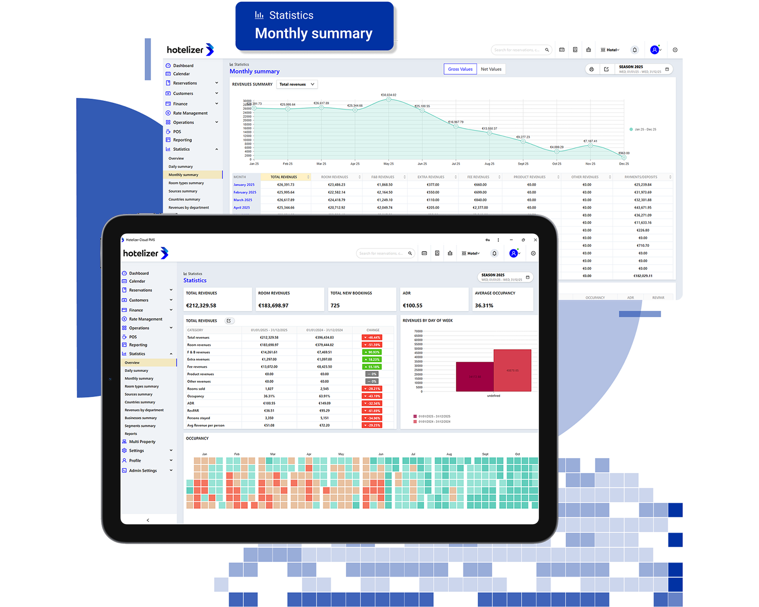 Παρακολουθήστε την πορεία του ξενοδοχείου σας με 100+ reports για έσοδα, πληρότητα, ADR και κρατήσεις. Απαραίτητα εργαλεία για στρατηγικές αποφάσεις σε όλη τη διάρκεια της σεζόν.