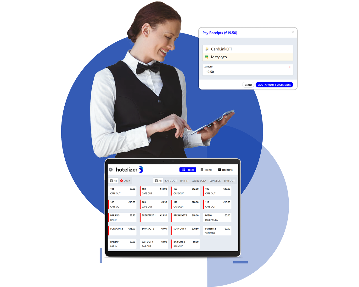Απλοποιήστε τη διαχείριση του F&B σας! Αναλάβετε πλήρη έλεγχο του bar ή του εστιατορίου σας, απευθείας μέσα από το hotelizer. Το νέο ενσωματωμένο POS καταργεί την ανάγκη για ταμειακές μηχανές, μειώνει τα λάθη και αυτοματοποιεί τις διαδικασίες παραγγελιών και τιμολόγησης.