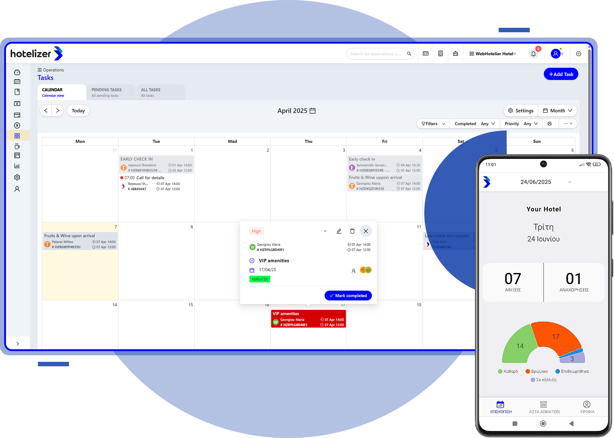 Αυτόματη καταχώριση κρατήσεων, συγχρονισμός διαθεσιμότητας και τιμών σε όλα τα κανάλια και στη μηχανή κρατήσεων webhotelier, αυτοματοποιημένη παρακολούθηση καθημερινών εργασιών με το Tasks, διασύνδεση με myDATA και app για το housekeeping σε 13 γλώσσες που ενημερώνει σε πραγματικό χρόνο για την πρόοδο των εργασιών.