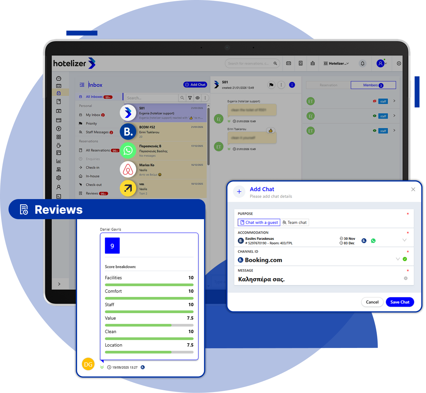 Με το Communicator έχετε πρόσβαση σε όλα τα μηνύματα των επισκεπτών σας από κανάλια όπως Booking.com και Airbnb, σύντομα και Expedia και WhatsApp. Παράλληλα, μπορείτε να διαχειρίζεστε τα reviews σας από την Booking.com, αλλά και την εσωτερική επικοινωνία μεταξύ των τμημάτων, εξασφαλίζοντας άμεση και αποτελεσματική συνεργασία, όλα μέσα από ένα ενιαίο inbox.
